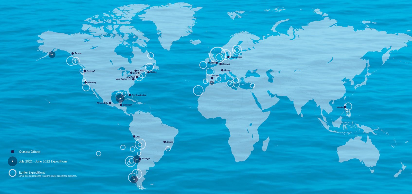 Since 2005, Oceana has led more than 60 expeditions and conducted thousands of ocean surveys across the United States, European Union, Canada, Chile, Mexico, Belize, the Philippines, Brazil, Peru, and the United Kingdom.